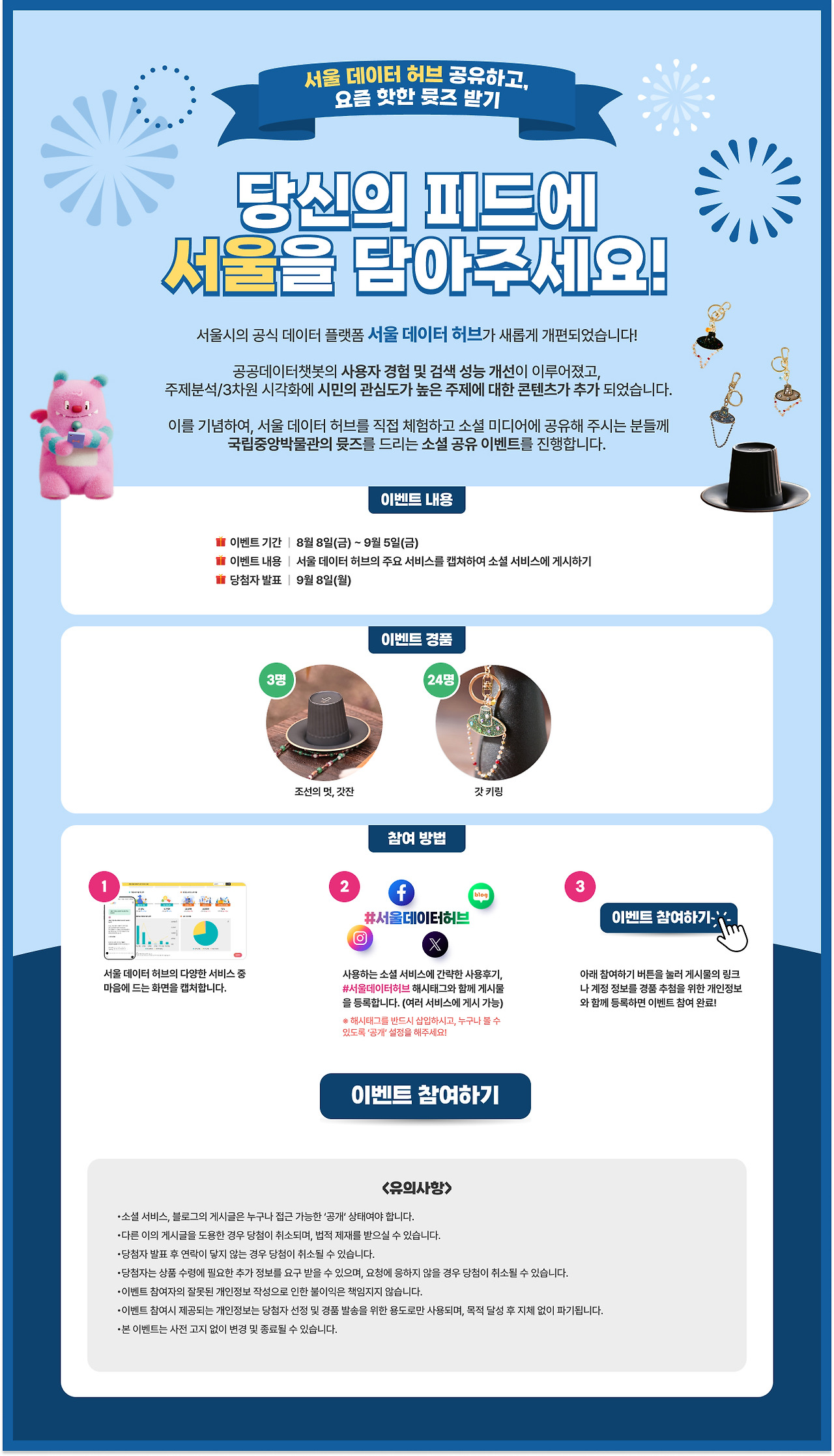 - 서울 데이터 허브 공유하고, 요즘 핫한 뮷즈받기~ <당신의 피드에 서울을 담아주세요> ○ 이벤트기간 : 8.8.(금) ~ 9.5.(금) ○ 이벤트경품 : 조선의 멋, 갓잔 3명/갓 키링 24명