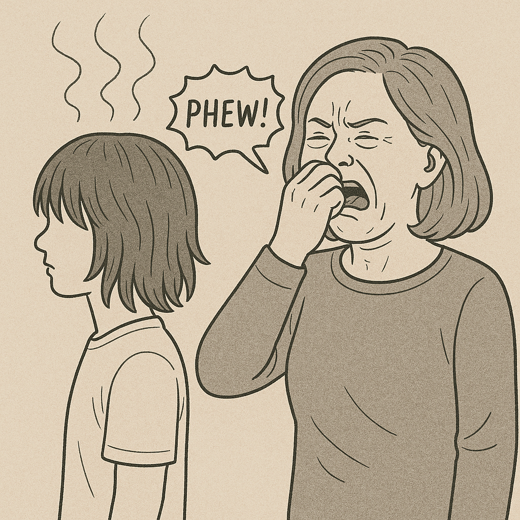 세탁 시 식초 1큰술 또는 탈취 스프레이를 마지막 헹굼물에 넣어 보세요. 베갯잇에 라벤더·유칼립투스 향의 섬유탈취제(무알코올)도 냄새 억제에 도움이 됩니다.