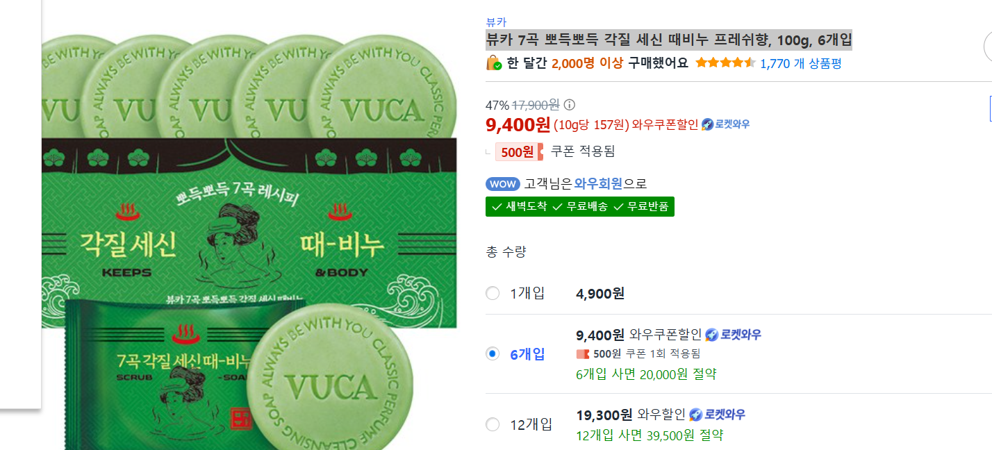 [100g 대용량이라 넉넉하게, 6개입 구성도 굿] 뷰카 7곡 뽀득뽀득 각질 세신 때비누