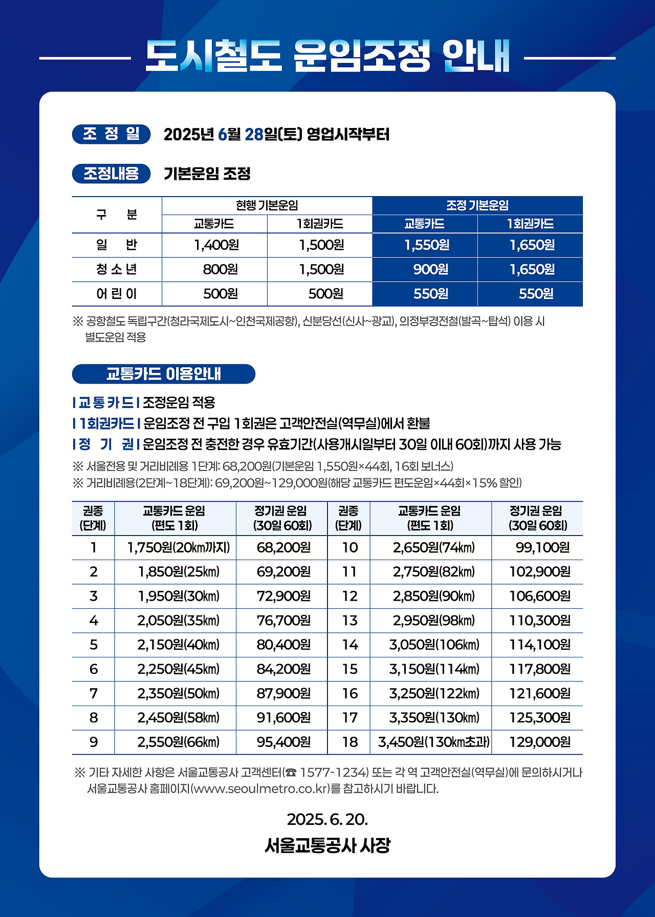 서울교통공사는 2025년 6월 28일(토) 영업 시작부터 도시철도 기본운임을 조정합니다. 이용하시는 고객께서는 변경된 요금을 확인 후 열차 이용에 참고하시기 바랍니다.